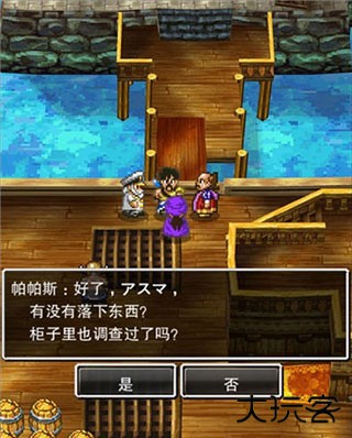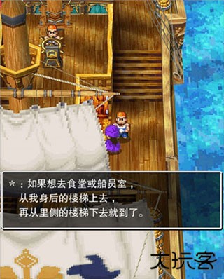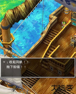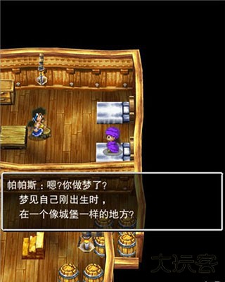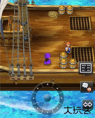 走出房间我们发现,原来我们是在一艘船上,这里需要我们调整一下视角才可以看到船帆后面的木桶,经常玩RPG游戏的玩家应该都和小编一样有个习惯,那就是每到一个场景都要把各个地方都搜刮一遍,玩勇者斗恶龙5也不例外。在开始的房间和甲板上我们先把柜子、图书架以及这些木桶全都搜查一遍,可以获得一些道具和物品