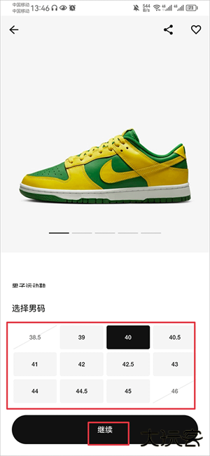 3、然后就是选择鞋子的鞋码,并点击继续