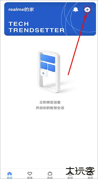 3、若果是首次打开APP,默认主页如下图,需要添加设备可以在主页点击“+”进入手动添加设备的页面(首次使用需要先登录realme账号)。