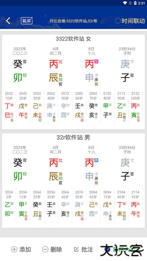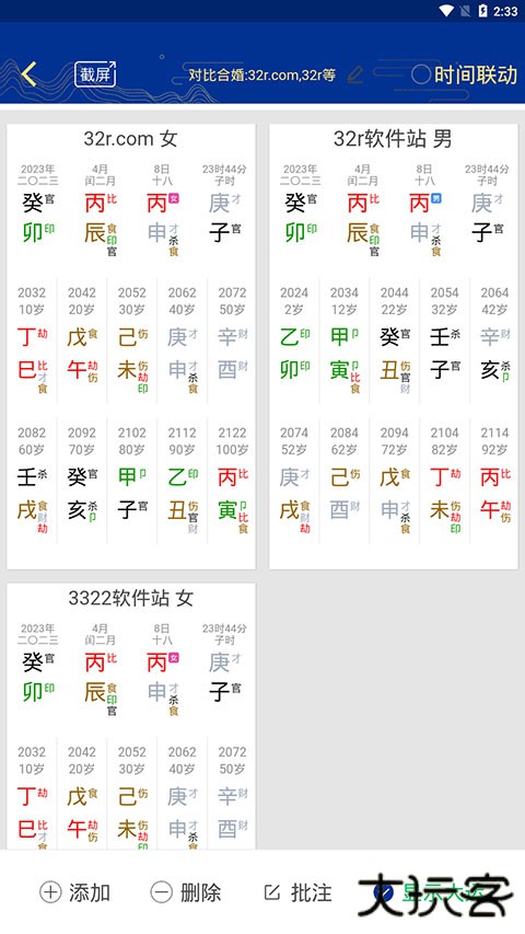 7、如果想比对更多八字命理,还可以点击左下角的【添加】按钮,并继续勾选对比对象。