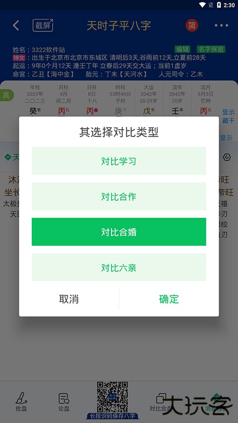 4、点击右下方的【对比合盘】按钮,还可以与其它八字比对学习、合婚等方面的命理。