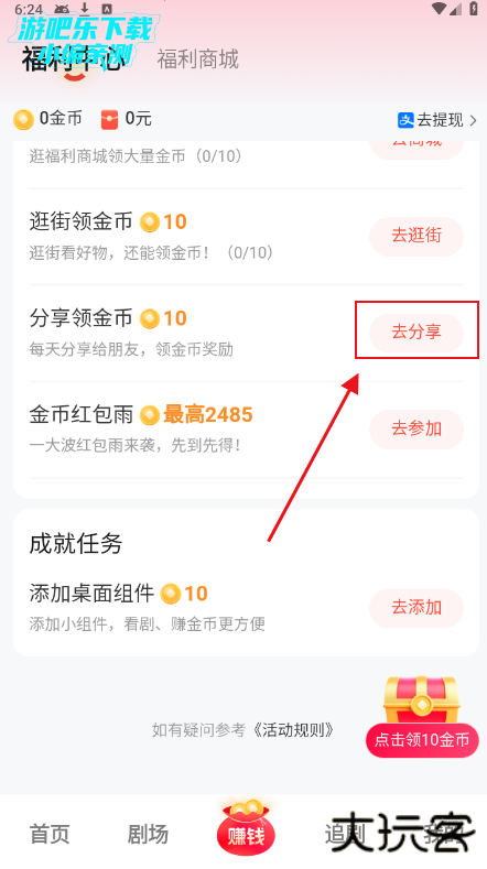 4、每天分享给好友也可以获得金币。