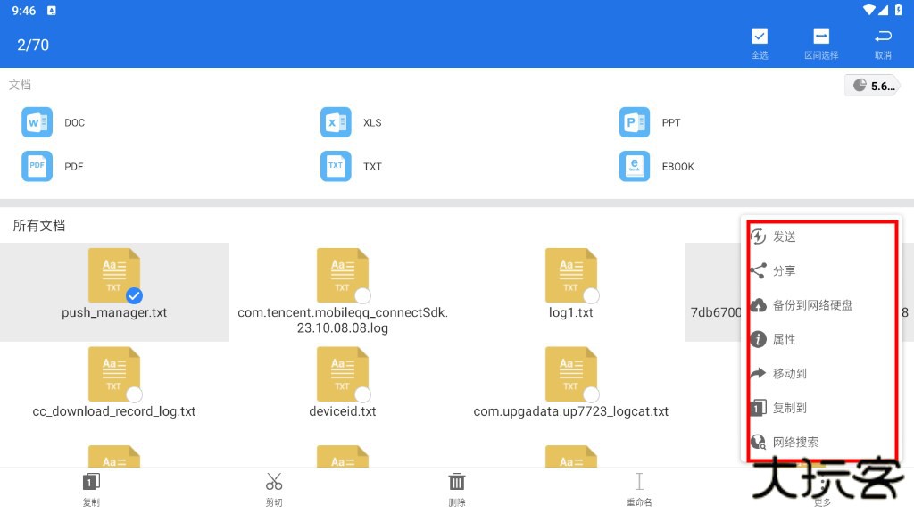 3、让文件在手机、电脑、网盘之间进行传输,并支持选择、复制、粘贴、剪贴、查看属性、解压、重命名、顶部等等功能。