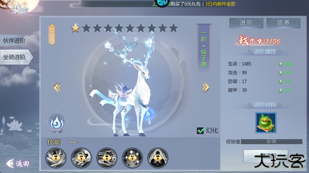 4、当玩家到达30级将解锁坐骑功能,在地图上可以使用坐骑,进阶坐骑会大幅度提高自身战斗力。