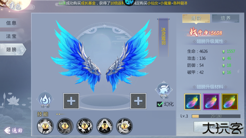 5、当达到45级时可以解锁炫彩翅膀,不仅是炫酷外观,升阶后还能提升战斗力。