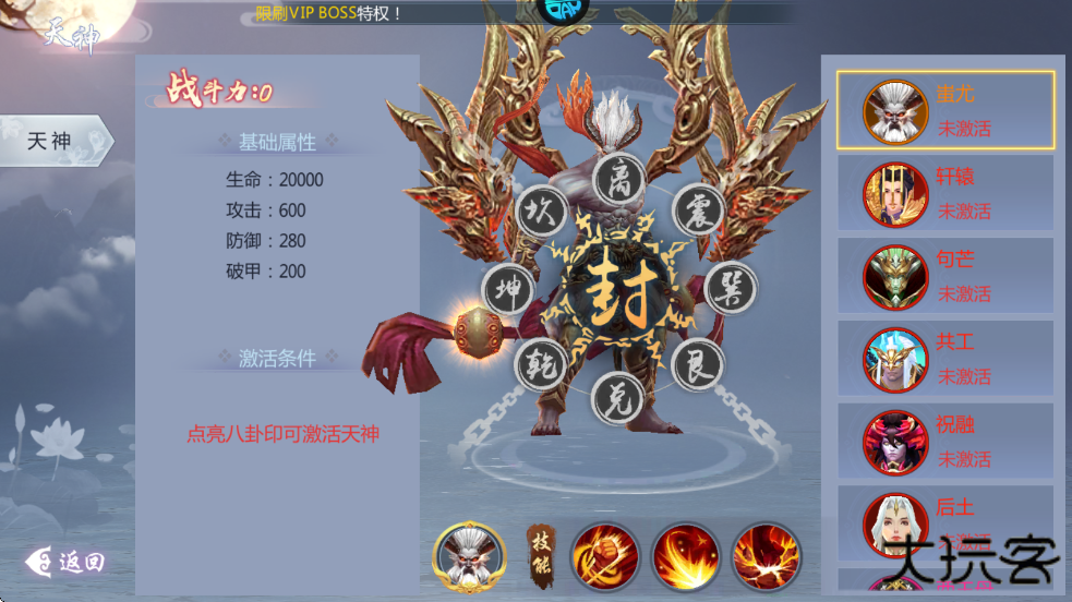 6、50级解锁天神觉醒,变身觉醒,使伤害大增,需要点亮八卦印就可以激活天神。