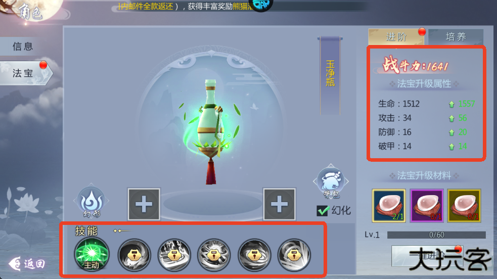2、10级开启极品法器,升级和进阶法宝可以增加战斗力,当法器达到10级、40级、100级、170级和260级时,可以解锁新的技能。