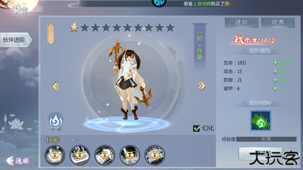 3、20级解锁辅助伙伴功能,也是提升战斗力的途径之一,伙伴升阶后会获得新的技能与造型。