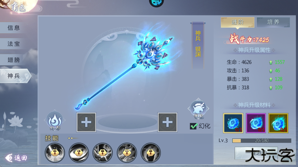7、55级解锁神兵,选择的职业不同获得的神兵也是不一样的,进阶神兵可以解锁更多的技能。
