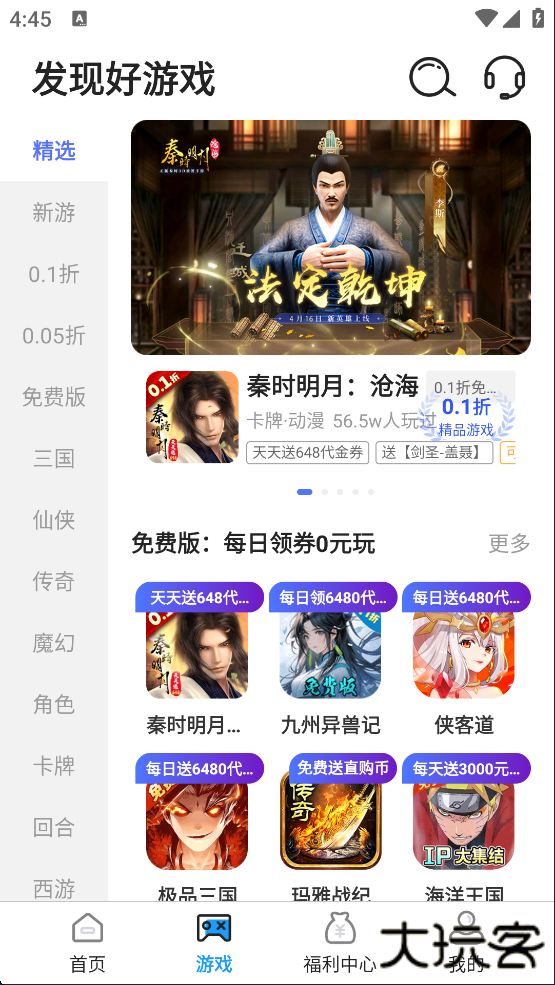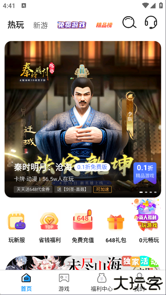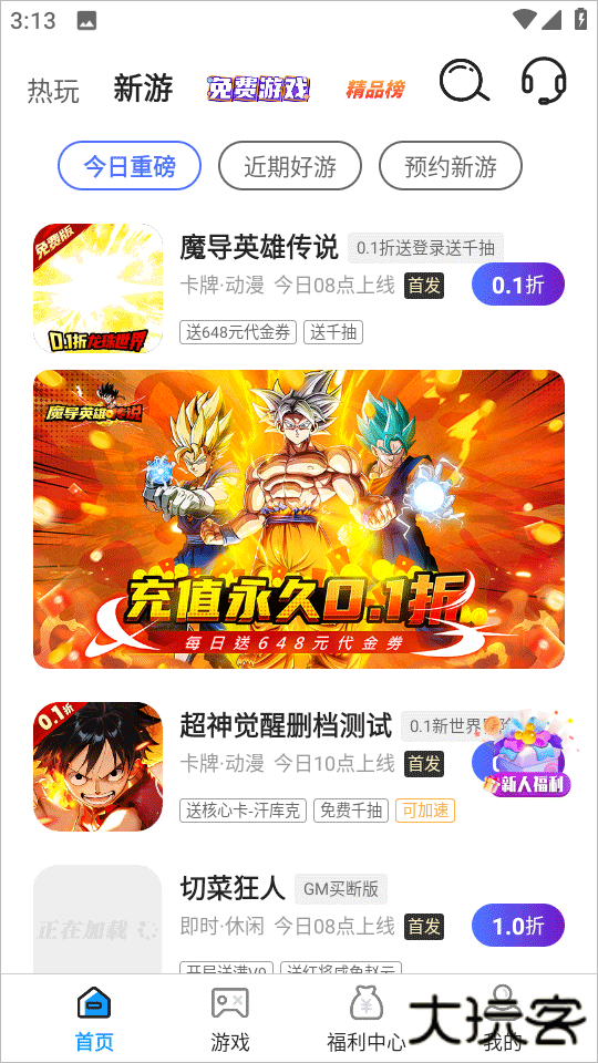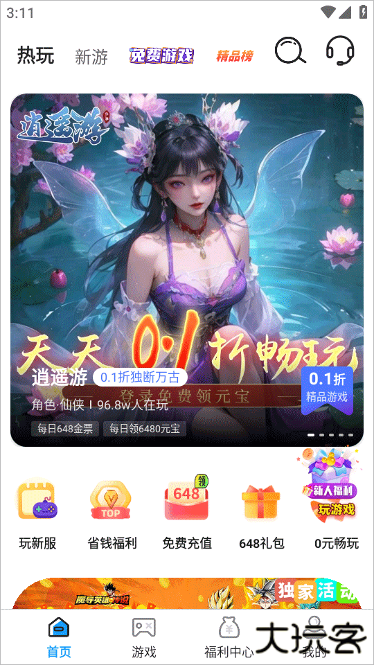 1、下载安装好0.01折手游盒子平台,运行软件并进入,可以看到有热游、新游、免费游戏、精品榜等等;