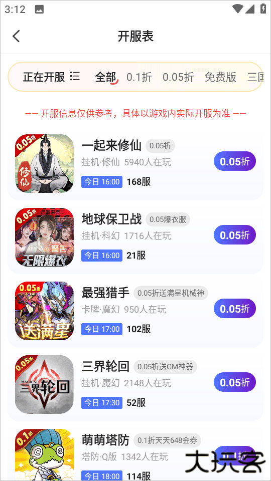 2、点开玩新服,可以看到各种热门游戏的开服表,还有多种折扣手游;