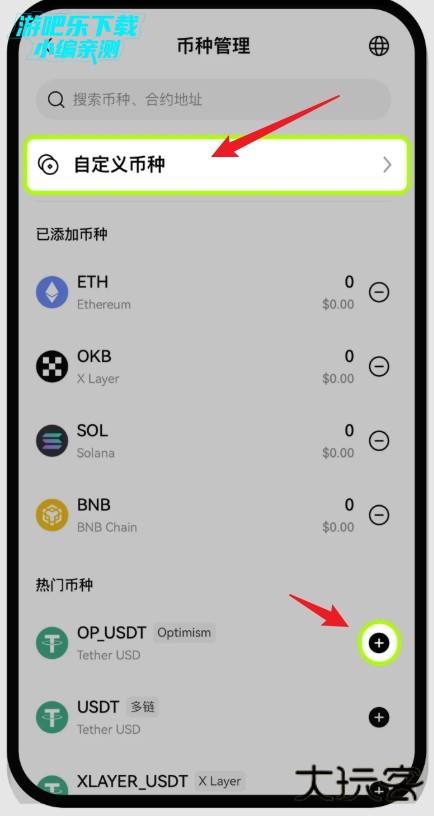 如果搜索不到该币种,您可以点击【自定义币种】按钮,手动选择网络和协议,输入币种名称后完成添加。