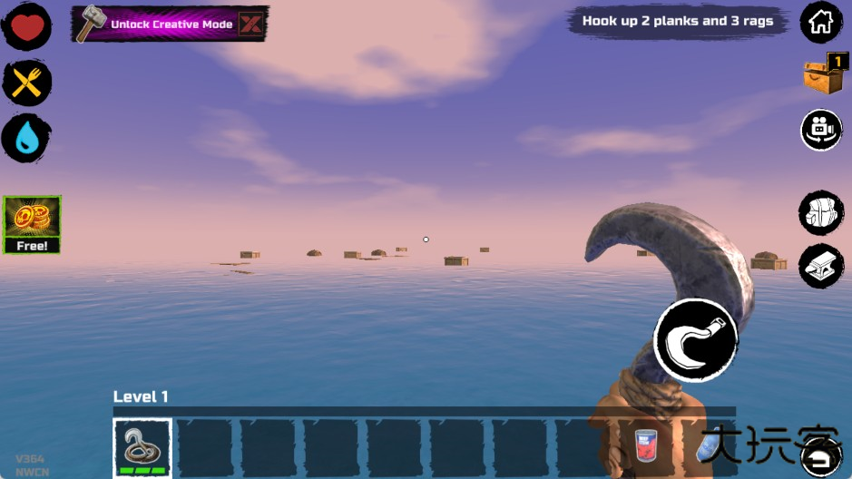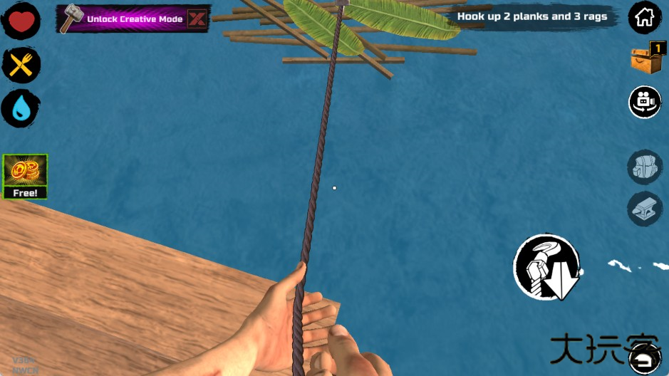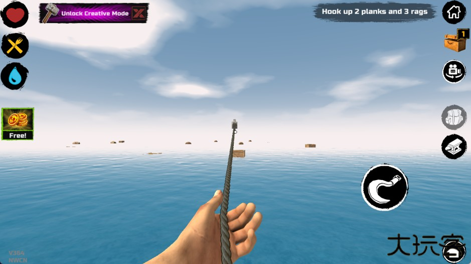 最初的游戏阶段,你出生时只有一个小木板作为活动空间和一个钩子。鲨鱼会不定期来攻击你的木板,如果你选择不抵抗,它会不停地咬,直到把一块板子咬烂为止。所以,你必须尽快利用钩子收集资源。水上的资源大致分为四类: