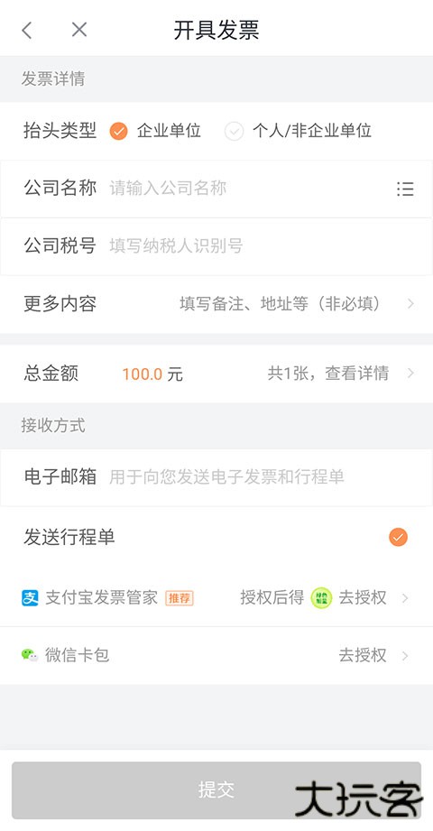 4、最后选择要开发票的订单,填写好【发票抬头】和【电子邮箱地址】,点击下方提交按钮即可。
