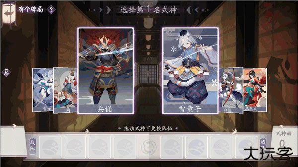 客人将经过八轮式神选择,组建两个队伍出战;每轮选择时,客人可以从两个式神中选择一个,而排在被选择式神后的两个式神,将成为下一轮的待选式神;每次选择式神后,将随机生成该式神8张卡牌组成其牌组。