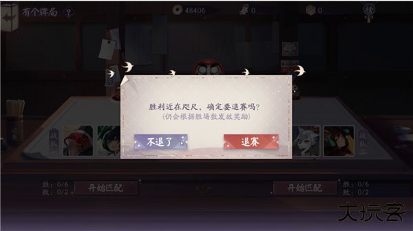 中途选择退赛仍会根据当前胜场发放奖励,但再次进入需要重新支付入场费用,纳豆酱可不建议客人中途放弃哦,如果有需求可以点击左上角的返回图标,退出“有个牌局”下次进来还可以接着进行匹配对局。