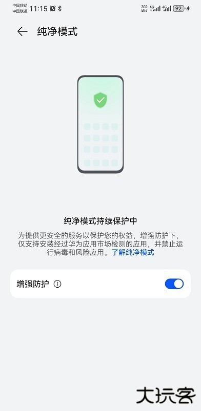 默认是开启的,把增强防护关闭掉,即可关闭纯净模式!华为应用市场不让安装怎么办,基本上关闭纯净模式,就可以正常安装使用了。