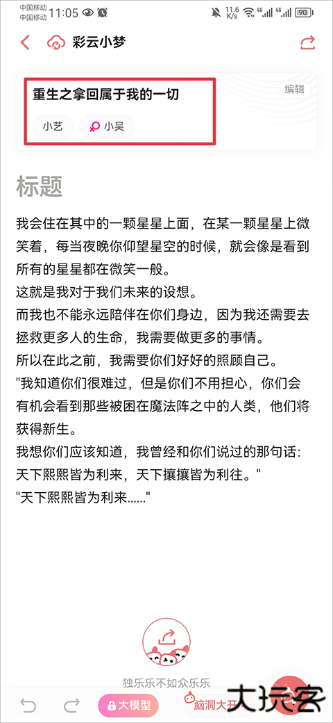 2、续写风格多样化彩云小梦内置多种续写模型——标准、言情、玄幻、纯爱,点击右上角自由切换模型,可根据偏好续写不同风格的内容。