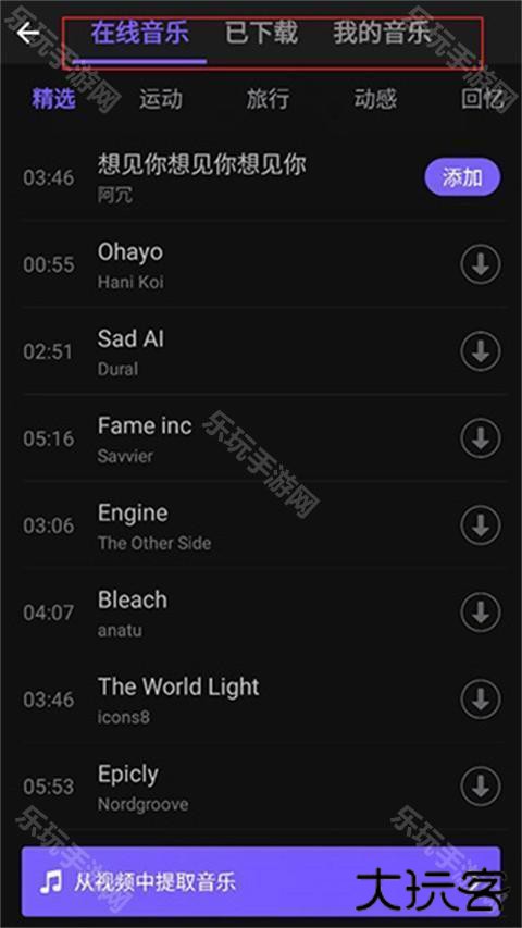 4、点击音乐,支持添加在线音乐、已下载、我的音乐库,下载自己喜欢的音乐,点击添加即可;