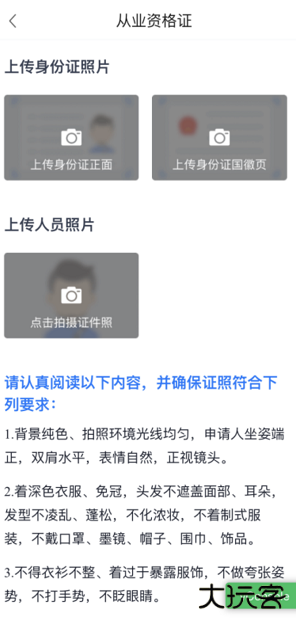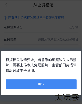 如果用户缺少对应的从业资格证人员照片,则会提示:根据相关政策要求,当前您的证照缺失人员照片,需要上传本人免冠照片,主管部门完成审核后领取电子证照。点击确定后进入到拍照流程。