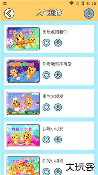3、在进入到经典童谣界面当中之后,用户可以看到界面当中为我们提供了很多很多经典童谣,比如小兔子乖乖、两只老虎、一只哈巴狗等等内容,用户如果感兴趣的话可以点击界面中的爱心来进行关注收藏,更是可以点击右侧下载的按钮来进行歌曲内容的缓存。