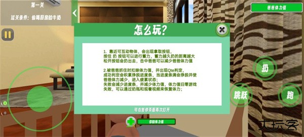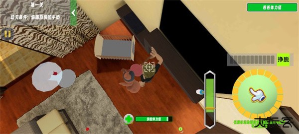 3、被爸爸抓住时扣驶体力值,并出现ONe判会珍脱并使或功判定会脱度弹反进度荷体力减少,进入疲画状市:失败命减少进度条,并减少体力值,体力值旧等游戏失败,可以调谊奶最来家复体力;
