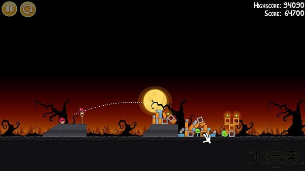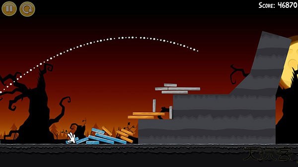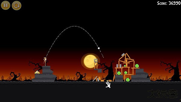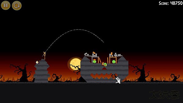 1-13:第一个回旋鸟按图中轨迹击溃建筑整体(有一定几率一鸟全灭),第二只鸟的位置跟第一只鸟差不多,只要击中位置网上一点即可,要确保左边的石砖倒向南瓜堆,一定要砸南瓜堆,否则无法三星!