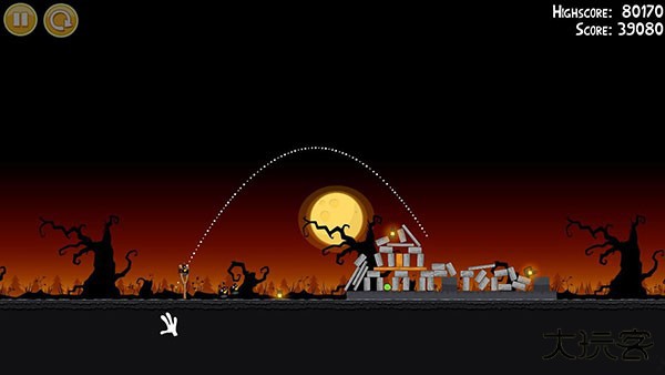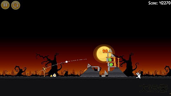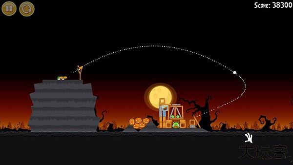 1-17:第一个炸弹按照图中轨迹首先摧毁建筑结构和南瓜(一定几率一鸟全灭),第二加速鸟非常重要,需要准确击中右边的木条,让右边的建筑往左边倒!