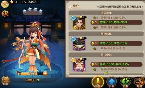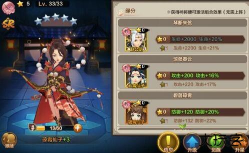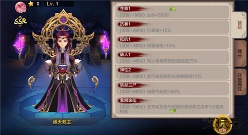 分析:技能上看是后排杀手,恐怖的伤害,驱散攻击目标增益状态高,可以用来针对敌人后排辅助,后续成长主要提升输出能力,觉醒+4以后人教伤害输出伤害提高25%,单体中SR英雄输出最强,缘分激活比较难,需要3个SSR英雄,所以前期缘分偏弱,考虑到成长空间强大所以强力推荐。