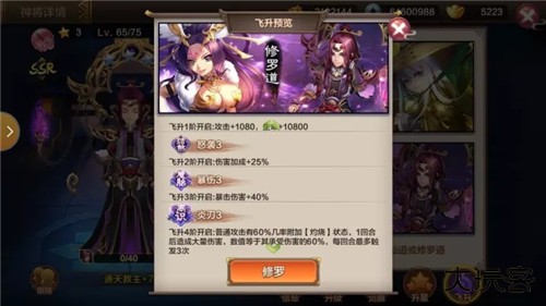 其次我们看一下修罗的飞升属性很完美的加了增伤和暴伤,飞升修罗后的通天一个普攻就可以造成不菲的伤害,与其不稳定的封印套路我觉得还是输出让人更踏实