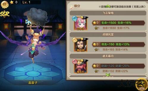 分析:阵容前排正好缺个强力防御,在其他SR英雄中间找不到更合适的,但是培养一个SSR雷震子压力少很多,慢慢来把这套阵容培养起来还是很强大的,后续成长空间也主要是防御,减伤的,缘分激活比较简单,除了一个还没有开放的SSR英雄都可以轻松激活,雷震子目前也是最强防御英雄,值得培养。