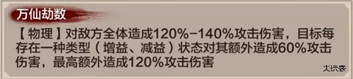 鸾飞凤舞:对敌方后排单体造成280%攻击伤害,暴击后对敌方全体造成本次伤害的30%,限制就是这全体伤害无法暴击,无法被格挡。