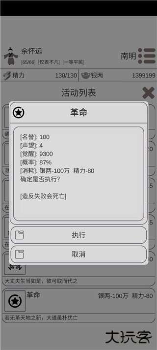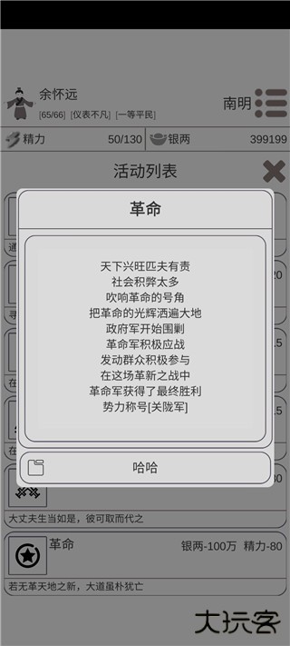 因为看到有人说革命一直是0,所以我就特地试了一把,60多岁的时候成功了因为没关注大明的稳定度,所以一不小心让其分裂成南明了,多花了一段时间