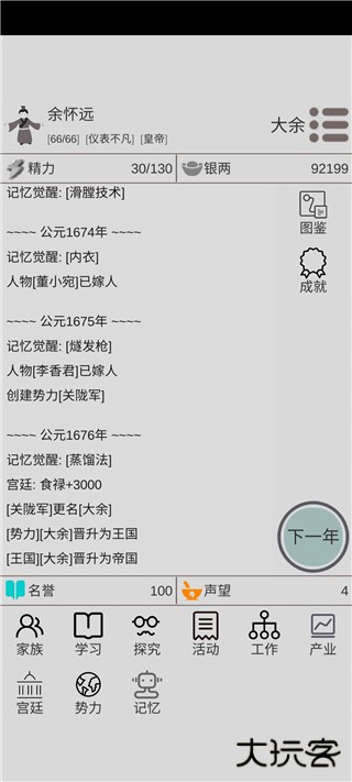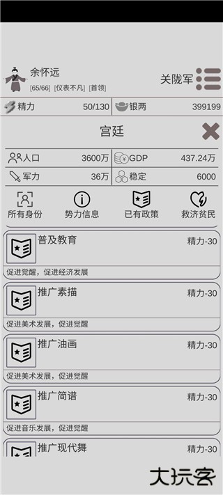 首先是钱,有了100万赶紧去宫廷解锁觉醒相关政策,越早越好,没什么政策就去研究艺术
