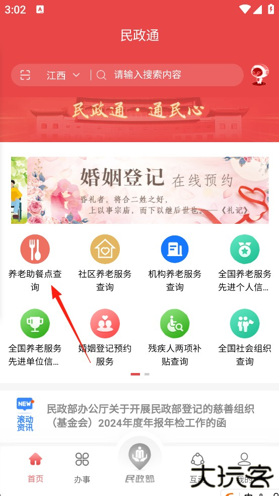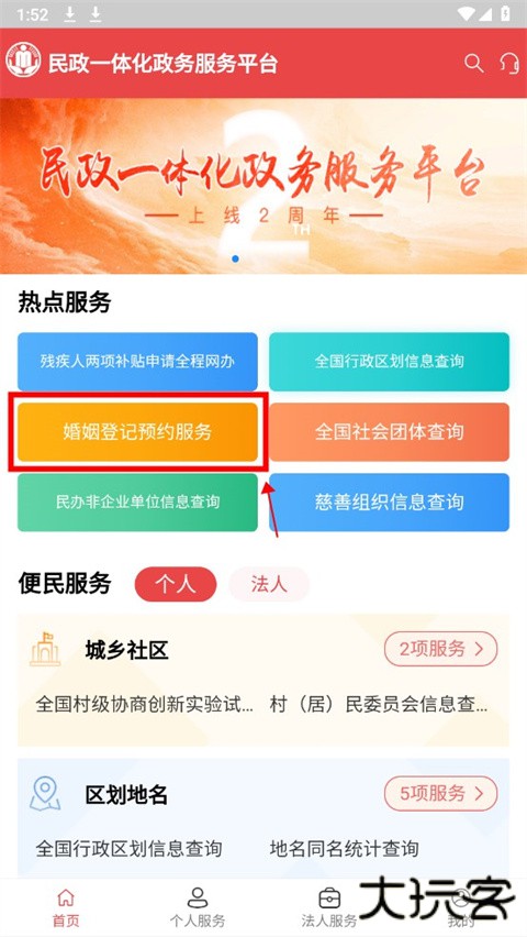 1、下载进入民政通App,在首页中点击婚姻登记预约服务;