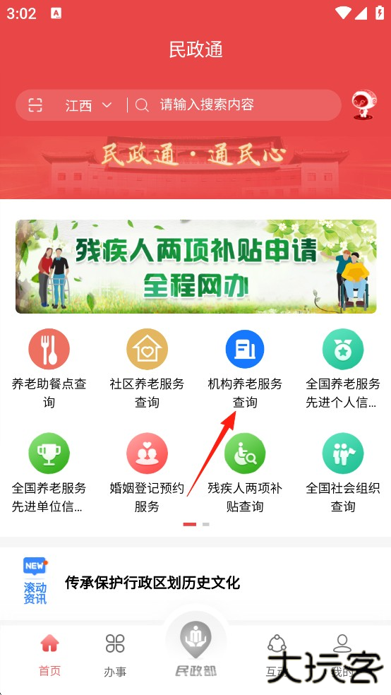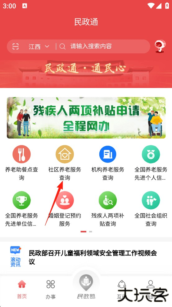 1、打开民政通App,注册登录后,点击进入【残疾人两项补贴申请“全程网办”】。