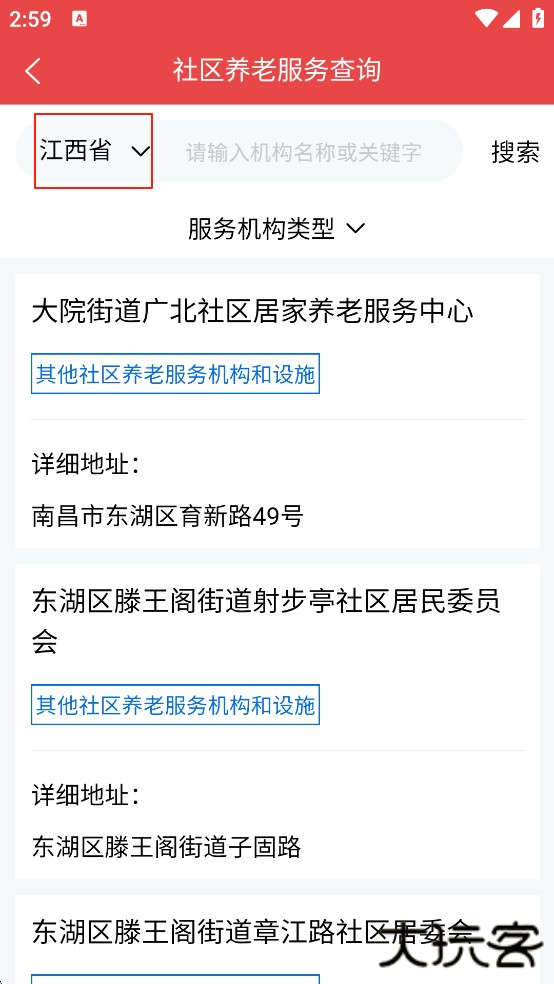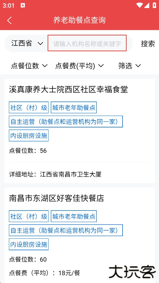 输入你想要查询的关键字,点击搜索,即可查询到相应的养老服务机构或设施。