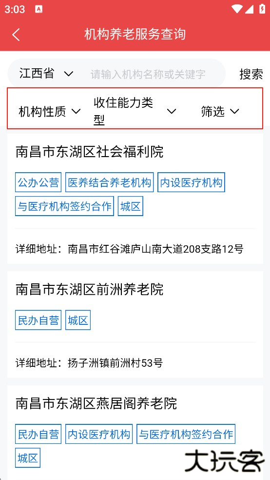 你也可以根据“机构性质”、“收住能力类型”等条件进行筛选,选择符合条件的养老服务机构或设施。