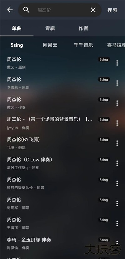 5、有了音源,再进APP进行音乐搜索,便可以搜索到音乐内容,搜索结果会按照不同音乐分别展示,不同音源搜索结果不完全相同。