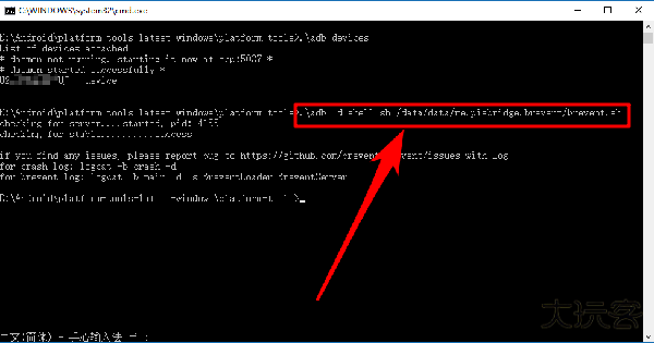 14、待我们的设备列举出来后,输入命令“.adb -d shell sh /brevent.sh”,从而完成我们对黑域手机端的授权;