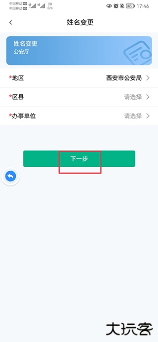 三、选择地区、区县和办事单位后,点击下一步。