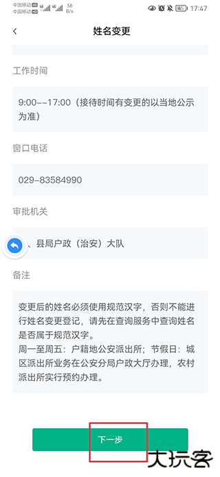 四、办事指南看完后往下滑,点击下一步。