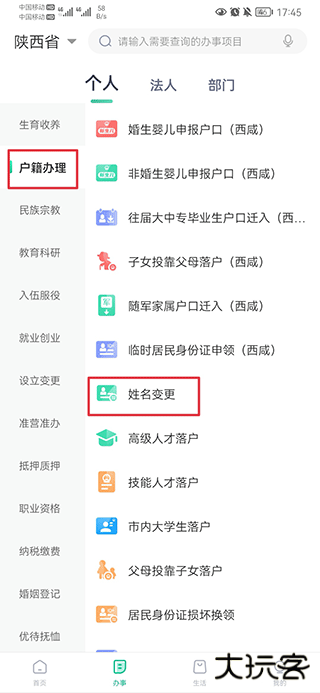 一、打开秦务员陕西政务服务app,在下方办事中的户籍办理找到姓名变更。