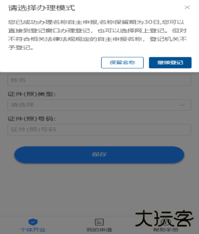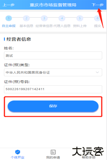 是否为经营者本人办理,点击【保存】,下一步