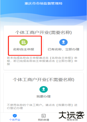 以需要名称的个体工商户为例。点击【名称自主申报】