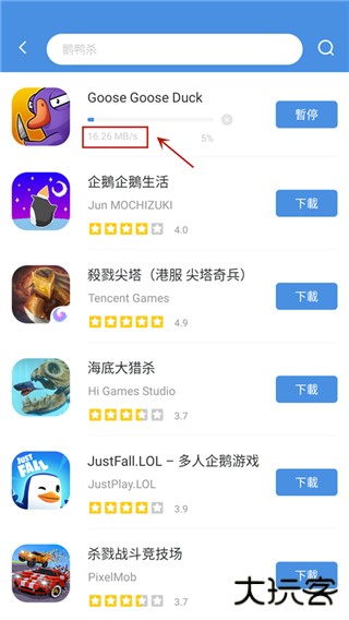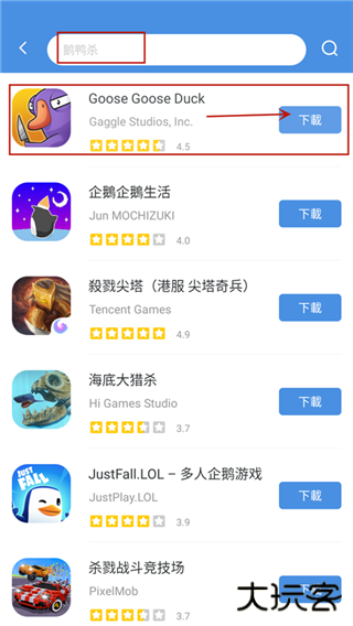 3、以鹅鸭杀游戏为例,在上方搜索栏输入“鹅鸭杀”即可在下方查看该游戏的评分以及厂商信息,点击一键下载即可。