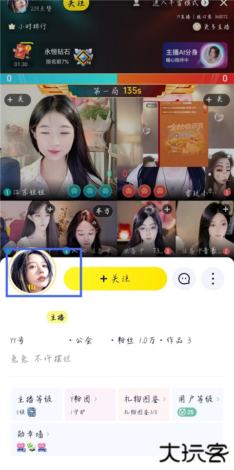 1、打开YY直播APP,进入直播间,点击主播头像。