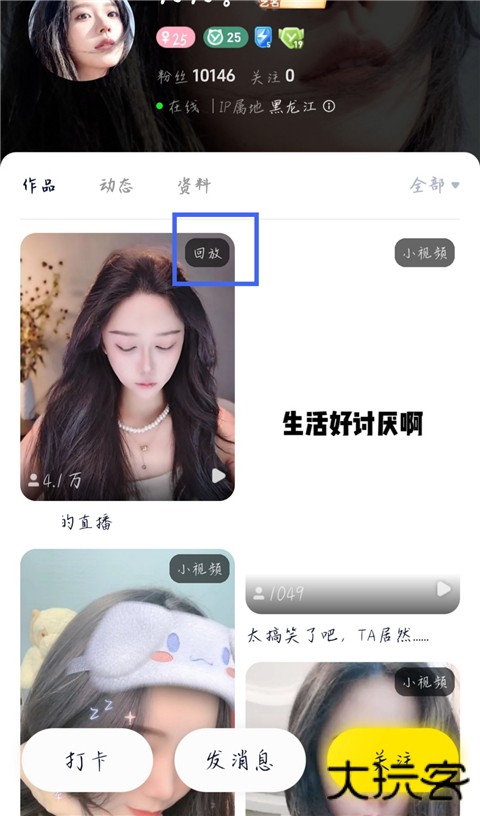 3、进入主播主页,在【作品】栏,点击标回放字样的视频就是直播回放了,点击观看即可。