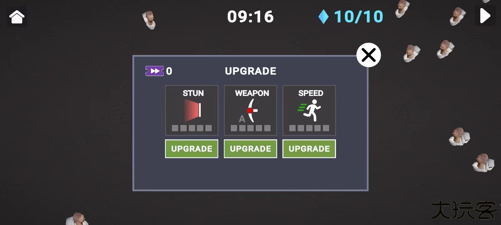 4、另外两种游戏玩法有点类似于吸血鬼幸存者,玩家需要消灭周围的出现的马桶人,注意不要让马桶人靠近自己,不然就会掉血;