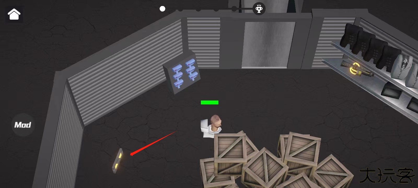 3、第二种是马桶人DJ,在这里,玩家需要操控马桶人躲避监控人的视线,拿到下图这个道具后,走到另外一个门才能赢得胜利;